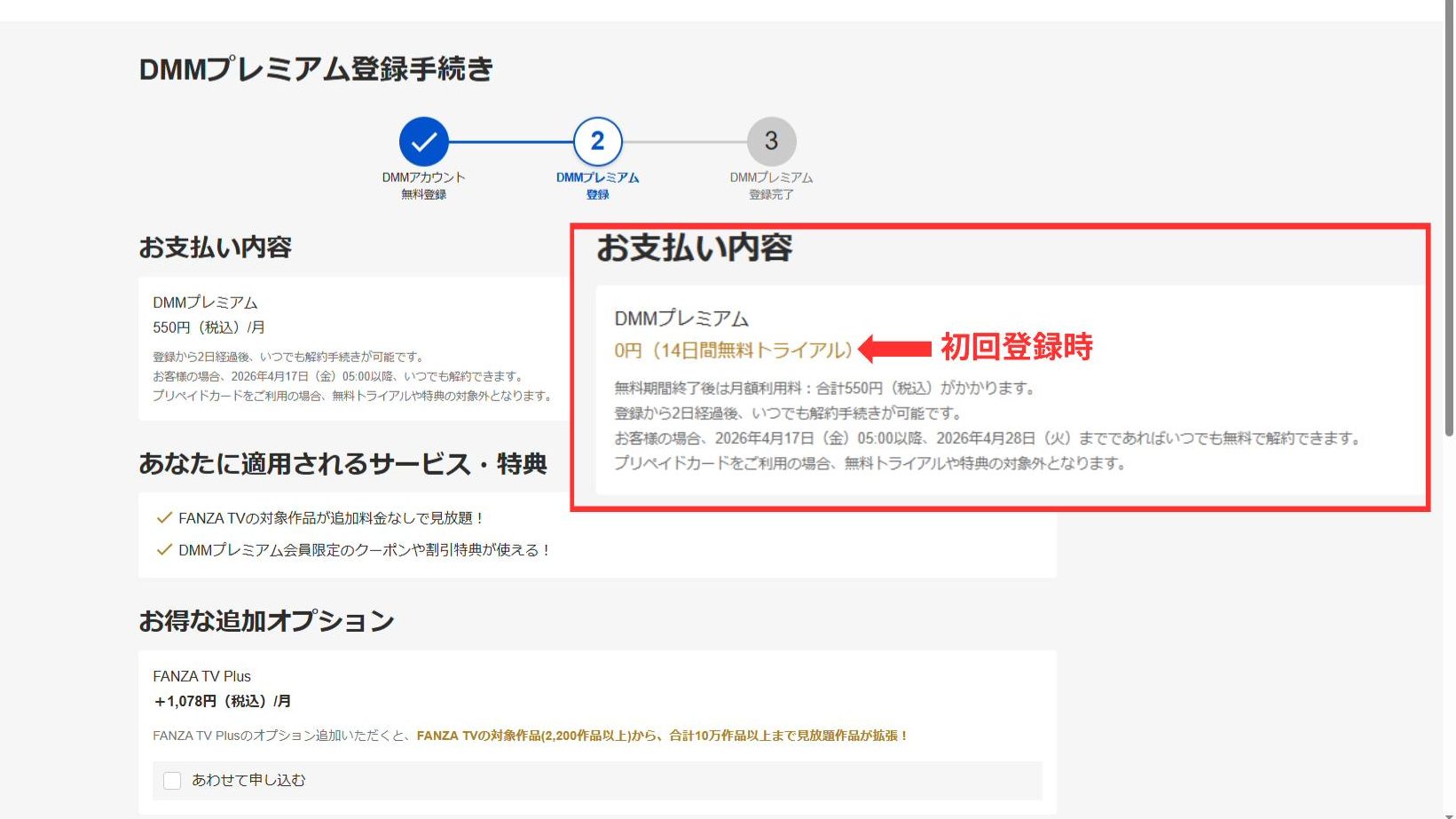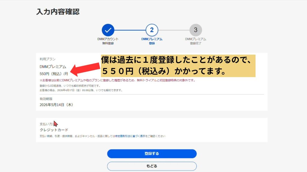 中野僕は過去に1度DMMプレミアムに登録したことがあるので、550円がかかってますが、初回登録の方は2週間無料です!
