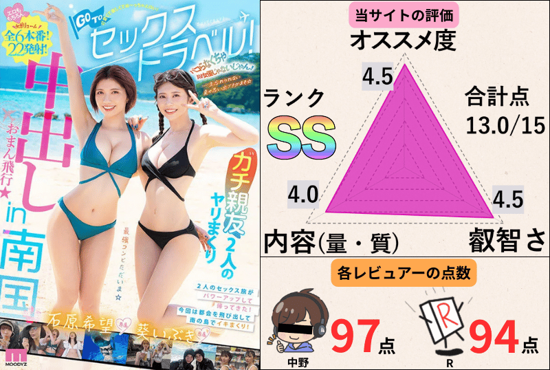 3時間20分という大ボリュームなのに一切退屈にならない石原希望さんと葵いぶきさんの面白い掛け合いや、かと思えば急にチャンネルが変わったかのように激エロのシーンに突入したりと、満足できるシーンが満載で文句なしの作品でした。